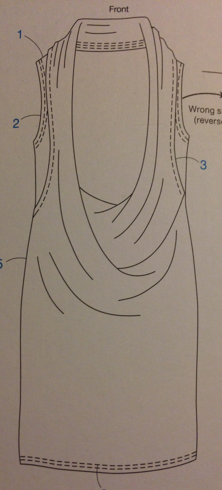 DD2CN_linedrawing Published February 25, 2014 at 927 × 2047 in Drape Drape 2: No.6 Three-piece deep cowl neck dress The line drawing – not actually very helpful for construction Drape Drape 2: No.6 Three-piece deep cowl neck dress