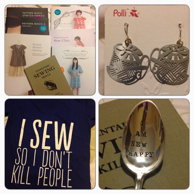 Japanese sewing books, ‘cotton reel’ earrings, t-shirt (enough said) and a very cute silver spoon!