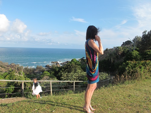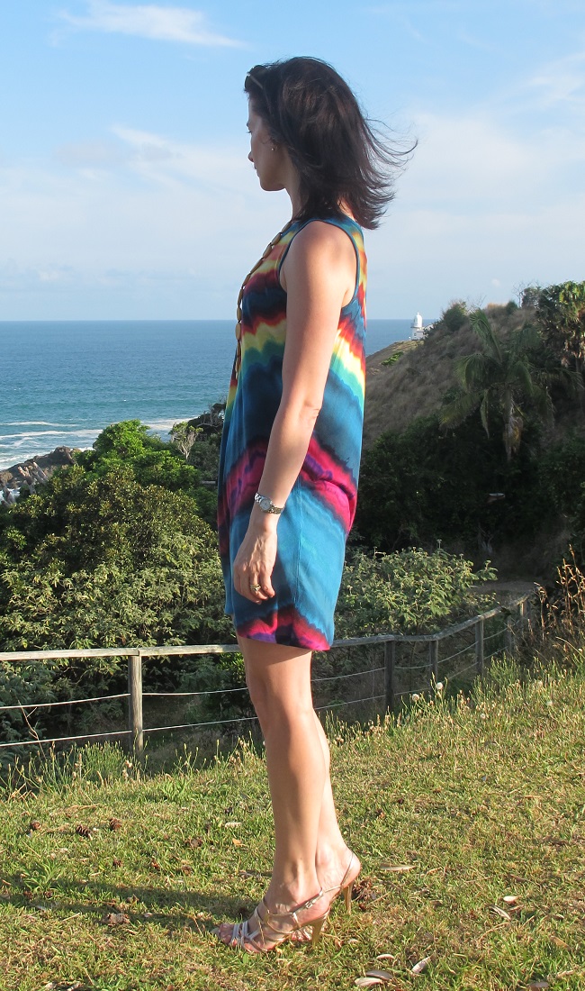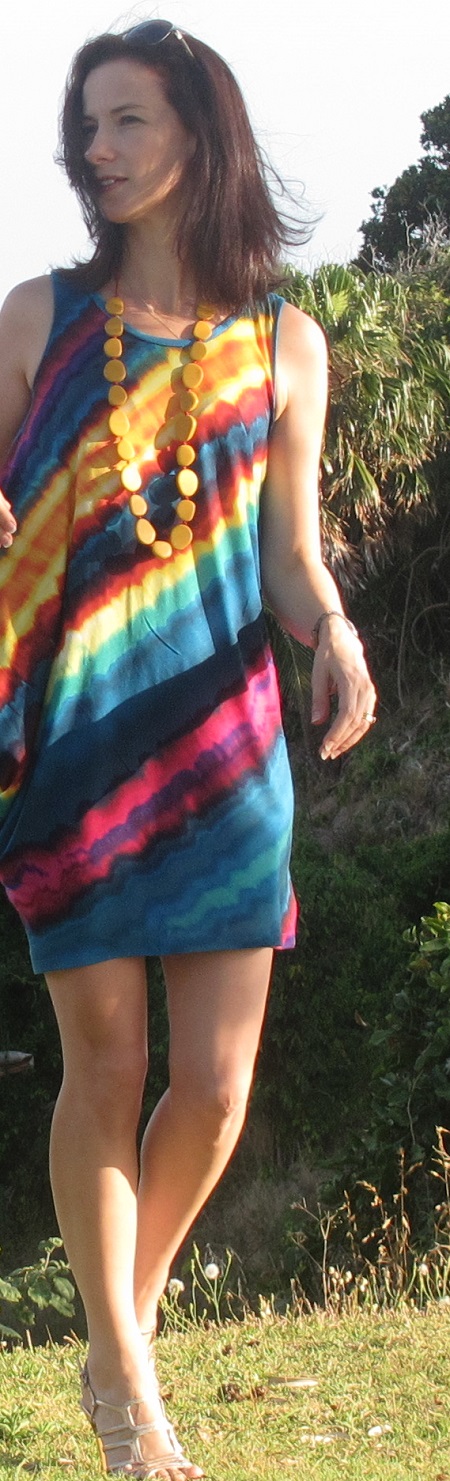 No 2. from Drape Drape 2. Without the drapes in view, it is a very simple singlet dress. Necklace is a resin by a company called Polka Luca. I fused the hem up as I didn’t want to interrupt the fabric design with a stitch line.