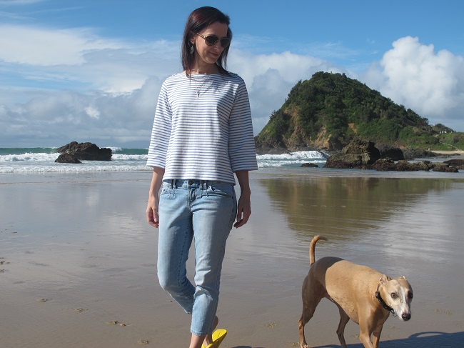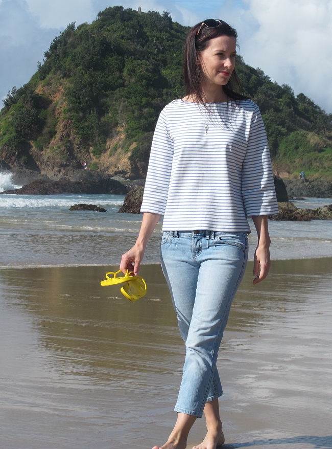 I scooped up a remanent of striped cotton jersey at Spotlight recently and immediately thought of this top. I had loved the softer blue stripe in this fabric for some time… however had not purchased it as it has little stretch and drape. When I picked it up again, I thought of this pattern and thought that the fabric having less drape/stretch would make it perfect for accentuating the slight bell shape of the sleeves and body of this top.
