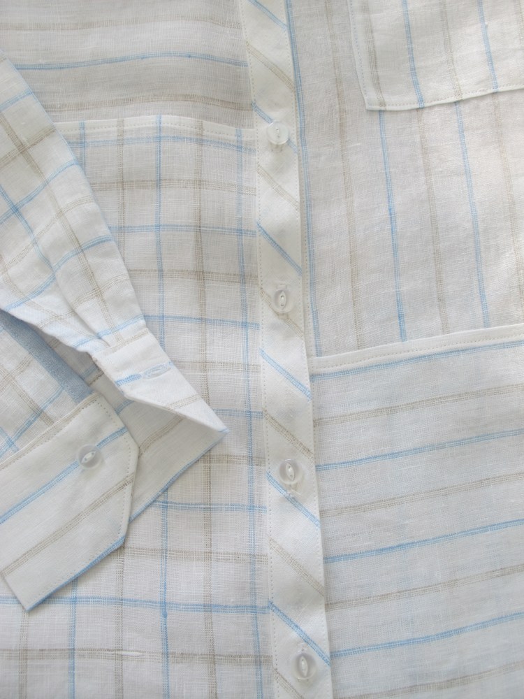 I was going to use just the checked and striped fabrics … but stumbled across a small sample of another De Linum linen in my stash which seemed like a perfect match, so added two very small touches, contrasting sleeve plackets and inner collar stand.