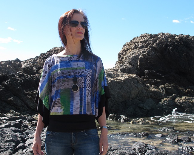 I was tempted to sew this top in silk… I think it would make a luxe top with skinny jeans or cigarette pants or a pencil skirt… however I opted to stick with the spirit of the book and found a budget-friendly fabric. I purchased this woven rayon, on sale, at Spotlight. It’s a lovely mosiac, stained-glass style print.