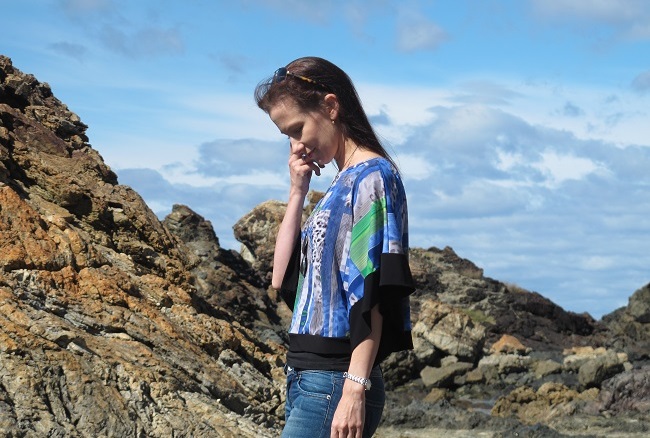 The body is very flared and the back drapes beautifully – yes ‘drapes’, of course I was going to love this! It’s a ‘business at the front and party at the back’ top. The back opening is wide/low and I had to tug my back bra strap down for the photos. I’d be tempted to raise the back ‘v’ a little next time as I hate fiddling with clothing that I am wearing. The tie across the shoulders does help keep the top in place and is a nice decorative finish.